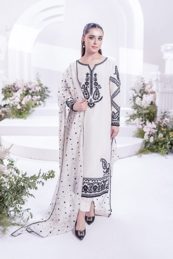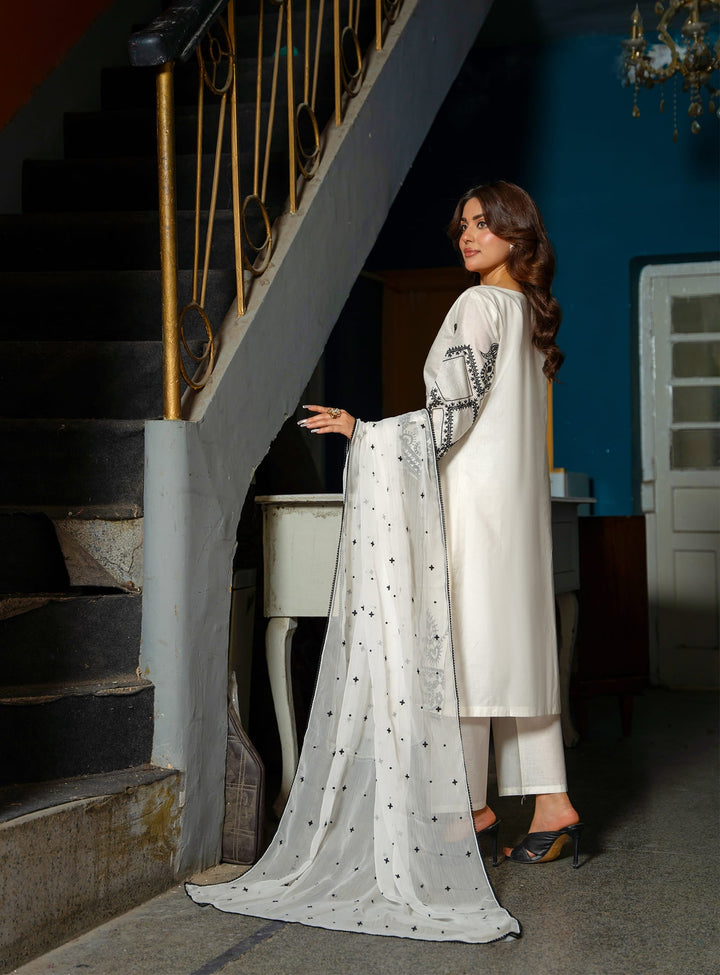 Designed in crisp cotton fabric, this stunning set features a beautifully embroidered long kurta paired with sleek straight trousers. The look is completed with a lightweight chiffon dupatta, making it the perfect summer outfit for daily wear. Fresh, graceful, and effortlessly chic – Ayra White is your go-to for refined summer style.