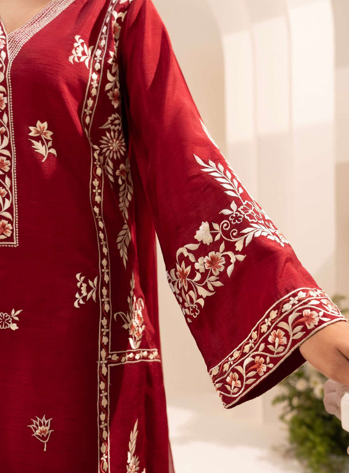 Make a statement with the Crimson Elegance stitched 3-piece cotton suit. Featuring a deep maroon shirt, matching trouser, and coordinated dupatta, it offers a rich, timeless look with breathable comfort.